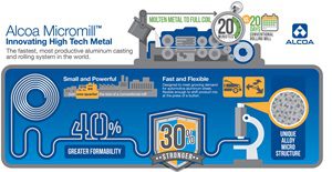 Alcoa’s Micromill technology produces an aluminium alloy that is 40% more formable and 30% stronger than automotive aluminium, while meeting stringent automotive surface quality requirements. Compared with parts made from high strength steel, automotive parts made with Micromill material are twice as formable and at least 30% lighter.