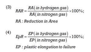 This slow deformation process allows the hydrogen to diffuse into the material and make the interactions with microstructural weak points, such as grain boundaries and dislocations, visible. The results of the SSRT test are then compared with a reference test in an inert gas such as nitrogen. A loss of ductility, reduced elongation at break or a brittle fracture are indicators of increased susceptibility to hydrogen embrittlement. The SSRT method thus allows a precise assessment of hydrogen resistance. The effects of hydrogen embrittlement are quantified using formula (3), the calculation of the relative reduction in area ratio (RAR), or formula (4), the plastic elongation to failure ratio (EPR).