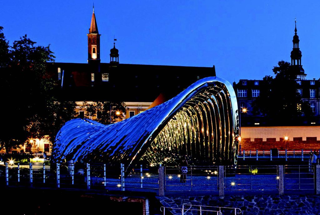 Daliowa is the smallest of over a dozen islands in the Polish city of Wrocław along the Oder River. The mirror-polished stainless steel arches form a gate-like passageway with fascinating reflections. Photo © Zieta StudioSurrounded by lush greenery in a prime downtown location, it was long regarded as a “forgotten” island. The spectacular NAWA pavilion by Zieta Studio brought Dailowa back to life, transforming it into a meeting place and event venue, thus becoming an integral part of the growing city. The tunnel-like installation consists of 35 arches arranged in a row, ranging from 4.5 m to 7.5 m in height. Their upward tapering shape references the historical vaults of nearby buildings. Together these arches create an organic form that appears to grow from the ground, harmonizing with the river and the surrounding nature.