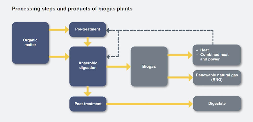 The biogas generated in the digester is collected through a network of pipes and transferred to a gas storage system, where it remains until it is ready for use or further processing. Biogas serves various purposes: it can be directly used as heating or cooking fuel or channeled into a combined heat and power (CHP) generator to produce heat and electricity. This flexibility makes biogas a valuable local energy source, suitable for households, farms, communities, and industries. Biogas or generated electricity can also be fed into the grid to contribute to the broader energy supply. Additionally, biogas can be further processed, resulting in a higher-quality fuel suitable for converted road vehicles. This upgraded biogas, known as renewable natural gas (RNG) or biomethane, has a similar quality as fossil-based natural gas, typically containing 90% or more methane.
