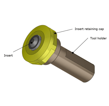 Following discussions with ceramic suppliers, it was identified that the significant cost elements in ceramic FSW tools were the bulk volume of ceramic and the finish grinding of the tool profile post-firing. To reduce bulk volume, a ceramic insert mounted in a reusable metallic holder was considered the best option. To eliminate the final grinding operation, the insert would be machined in the green state and then fired. The insert geometry adopted incorporated a tapered body for accurate location and flats for providing a drive feature. The insert had a 3mm probe length. A tool holder was designed to support and transmit the torque to the insert, as shown in Figure 1.