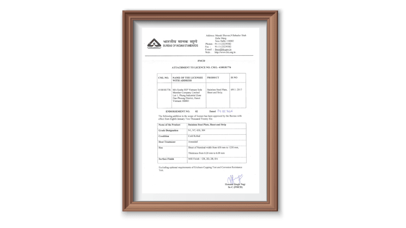 Son Ha SSP Co., Ltd. – a major stainless steel manufacturer in Vietnam – has officially been granted certification by the Bureau of Indian Standards (BIS) for its cold-rolled stainless steel coil products, marking an important milestone in its journey of market expansion and deeper integration into the global supply chain. Achieving BIS certification is not only a recognition of Son Ha SSP’s manufacturing capabilities but also opens up opportunities for sustainable cooperation with partners in the Indian market.