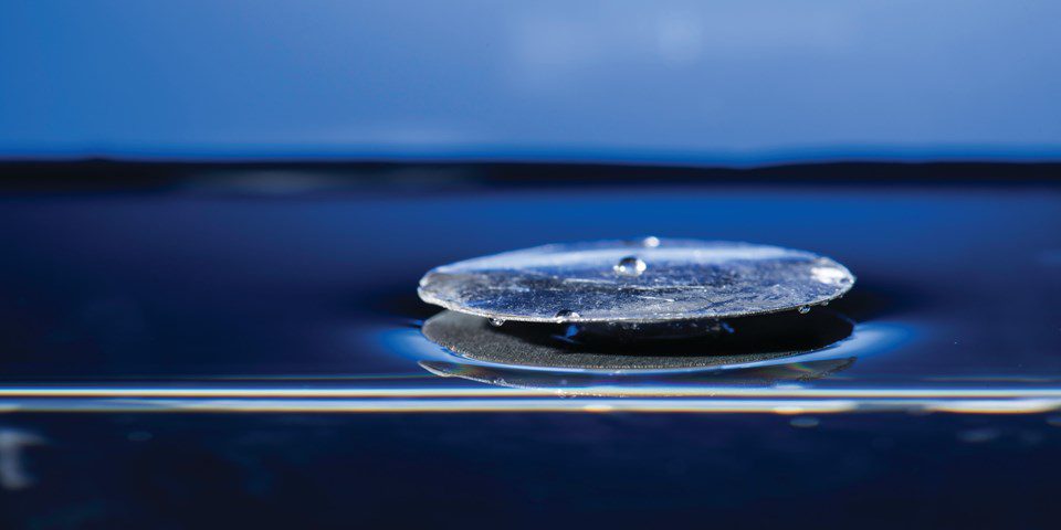 ^ Superhydrophobic metallic structure floats on the water surface in the Guo lab.