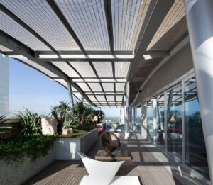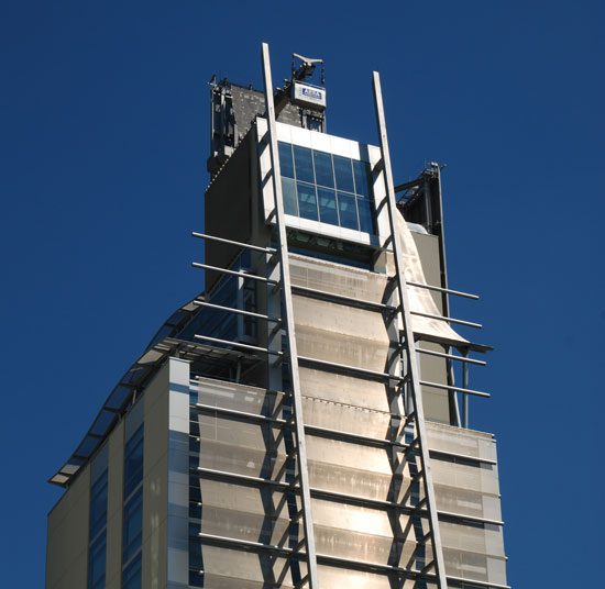 At the level of the executive offices on the upper floors, the recessed internal spaces made it possible to create large open terraces protected by stainless steel mesh sails (Figure 2). On the southern side, an inclined tubular superstructure connects the lower portion of the tower with the upper section while supporting the external metal curtains.
