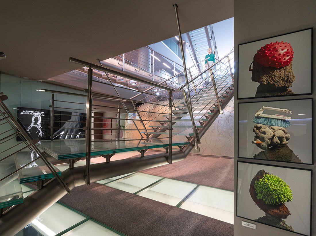 A museum gallery area, meeting rooms and reception and waiting areas overlook the three-level entrance hall, the facade of which is distinguished by a huge glass painting. The stairs and connecting ramps appear to hang in the void, enhancing the illusion of them ‘breaking through’ the three-storey high space.