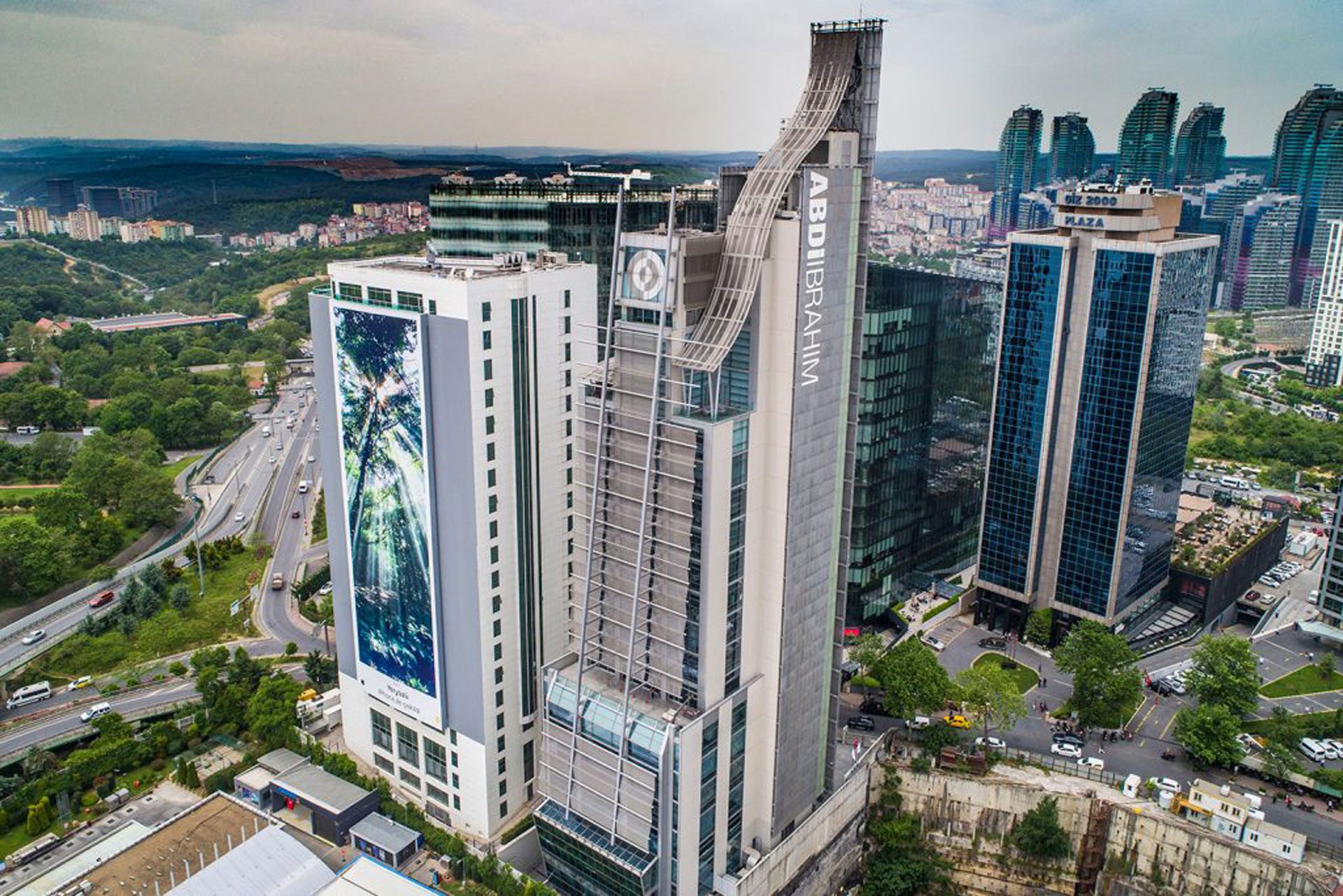 A towering skyscraper in the central business district of Istanbul stands out as a striking example of Italian architectural design.