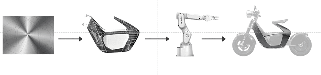 The STILFOLD technology, dubbed “industrial origami”, involves the use of robotic arms to fold flat sheet metal over curves to form light and sustainable new structures using minimal component parts. The technology is currently being used to build the chassis of a light electric motorcycle called the STILRIDE 1, the world’s first climate-neutral car (in collaboration with Polestar), and to develop greener urban mobility infrastructure (in collaboration with Alstom).