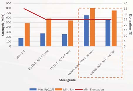 Another advantage of UREMIUM29 is its very high yield and tensile strength compared with other austenitic materials typically used in urea plants. Even at high temperatures, the material shows excellent mechanical resistance, with low strength derating, as shown in Figure 3. This means that there is a scope for wall thickness reduction with UREMIUM29, which implies important cost savings.