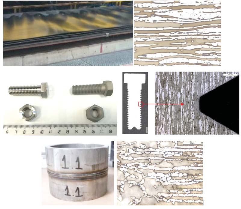 For complete utilisation of the advantages offered by UREMIUM29, TUBACEX has developed the full range of products requested in the different parts of urea plants. During the last few years, the company has extensively worked in the manufacturing of special products, such as small bars (R35, R65, R95), plates, bolting hardware, welding consumables: TIG rod and wire, SMAW electrode, strip band, etc. Pictures of these special products and the corresponding microstructures are depicted in Figure 4.