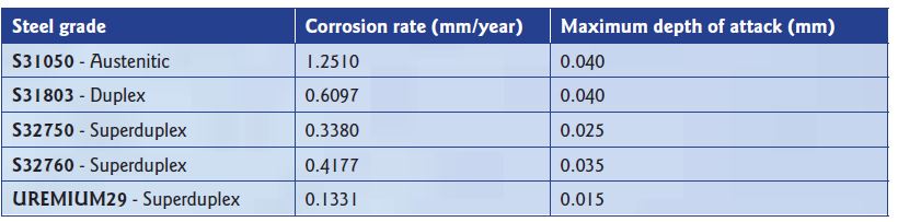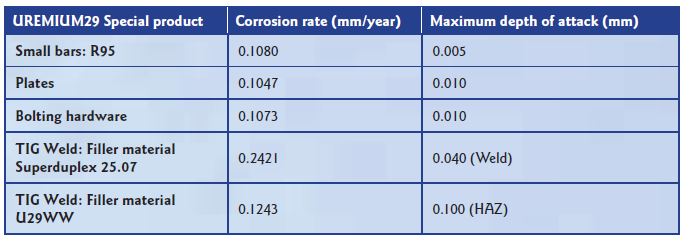 These products were also tested in the autoclave at the same corrosive conditions previously explained. The achieved corrosion rate and depth of attack for each product are summarised in Table 2. The corrosion rate measured for small bars, plates and bolting hardware was very low: around 0.1 mm/year. Corrosion rates were also very low for welded products when UREMIUM29 filler metal was used, and slightly higher when super duplex filler metal was utilised.