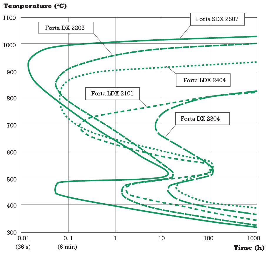 • Short term spikes (tens of hours at T=375 °C) are acceptable for DX 2205. As DX 2304 and LDX 2101 are lower alloyed grades, comparable short term temperature spikes should be acceptable as well.