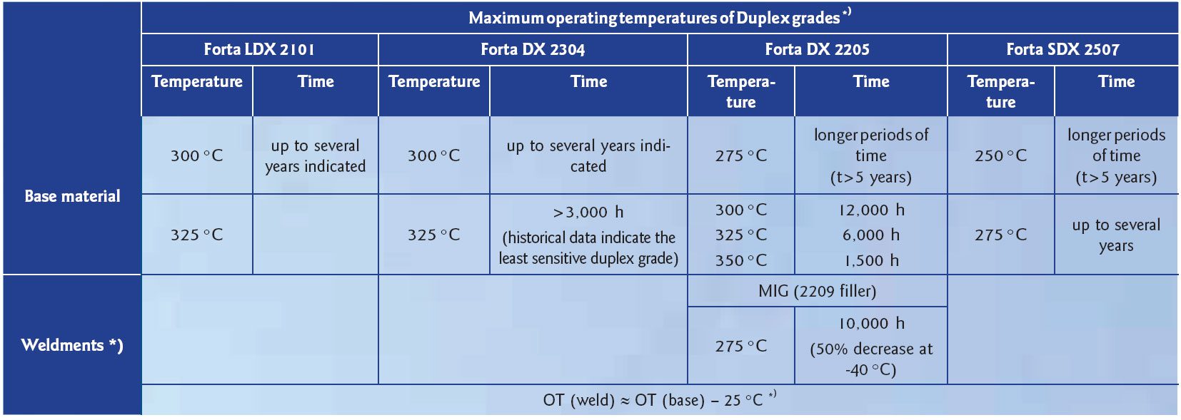 Information produced by several other manufacturers of duplex stainless steel was reviewed to see what they communicate regarding the temperature ranges for their grades. 2205 is limited at 315 °C by ATI, but Acerinox sets the OT for the same grade at only 250 °C. These are the upper and lower OT limits for the grade 2205, while in-between them other OTs are communicated by Aperam (300 °C), Sandvik (280°C) and ArcelorMittal (280 °C). This demonstrates the widespread of suggested maximum OTs just for one grade that will possess very comparable properties from manufacturer to manufacturer.