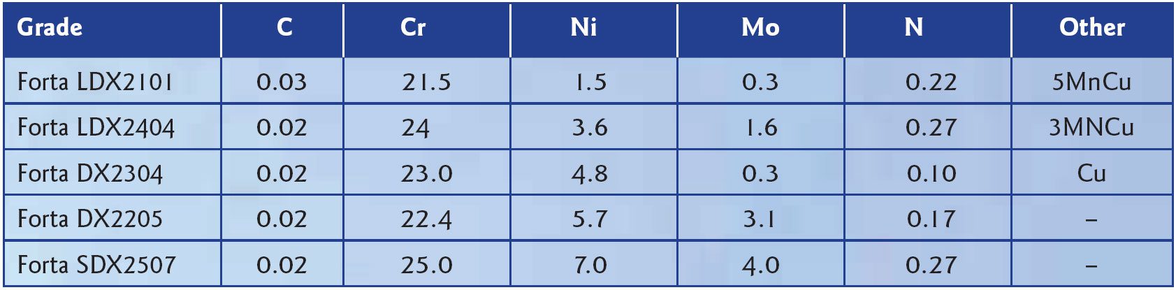 Typical applications that require duplex materials to be exposed to high-temperature conditions are pressure vessels, fan blades/impellers or exhaust gas scrubbers. The requirements for material properties can range from high mechanical strength to corrosion resistance.The chemical composition of the grades discussed in this article are listed in Table 1.
